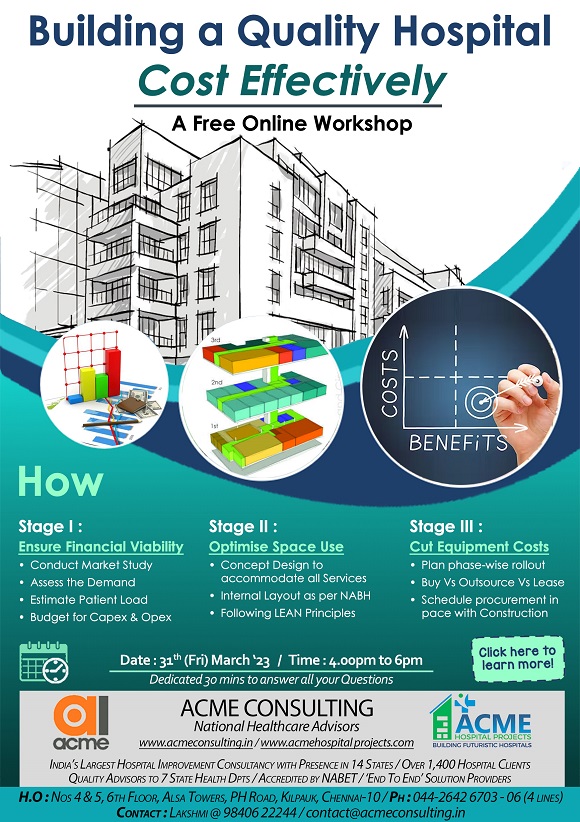 This Workshop was brought to you by ACME Hospital Projects, India's Largest Healthcare Advisory Group working in the field of Infrastructure & Quality Improvement. Our team of In-house Healthcare Professionals include Feasibility Experts, Architects and Hospital Planners, Equipment Specialists, Administrators, Quality, HR & Hospital Operations Managers. Here are the links to the video recordings of all the 3 Presentations and the Question & Answer Session that took place at the Online Seminar on "Building a Quality Hospital Cost Effectively". Our objective being to tell all Doctors, Corporates, Project Managers, Administrators, Entrepreneurs and other Investors who are planning to put up Hospitals and need to rise up to this challenge of building the Hospital, Cost Effectively.