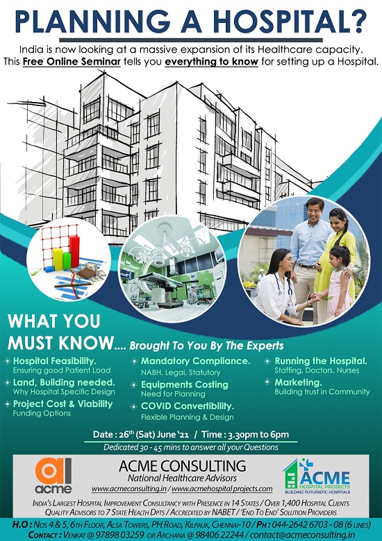 India is looking at a massive expansion of its Healthcare Infrastructure in the next few years, by adding New Hospitals and increasing the Services, Specialties and Beds in existing ones. This is a Seminar for all doctors, healthcare entrepreneurs and investors, brought to you by ACME Hospital Projects. India's largest Healthcare Advisory Group working in the field of Quality and Infrastructure Improvement. At this Seminar, We told everything that you need to know before taking the very important step of setting up your Hospital or expanding your Existing One, whether Green Field or Brown Field, Converting an Existing Building Structure.